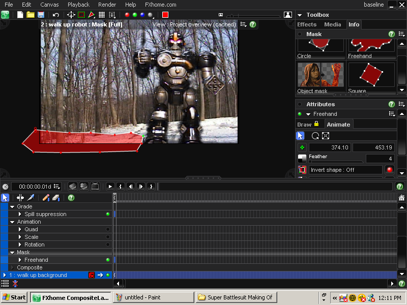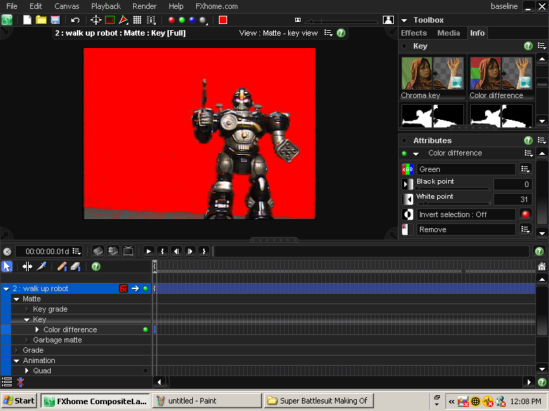 | I created a new project and brought in my background footage. Next, I brought in the robot footage and placed this above background clip. I then used Color Difference to remove the green. Spill Suppression to clean up the green reflecting on the robot A freehand mask to remove the unwanted surface that the robot walked on And finally a Grade filter to clean up the footage and make the clips blend better together. There was some more tweaking here and there to get a decent effect, but this gives you an idea of how the effect was achieved. Composting is an art form and no two projects are going to be exactly the same. I'm still learning and figure I'll get better each time. The FxHome website has some great tutorials on compositing. |