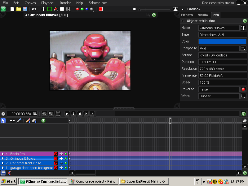 | My advice for using FxHome is simple; read the manual, watch the tutorials, experiment with the product, and join the forums at FxHome. The live action stuff was also straightforward. I removed the work bench and sat on my knees in front of the green screen. I could have gotten better results using my high quality green screen and brighter lights, but I was lazy and didn't feel like setting all of that up. The overlays for the 'heads up' displays were created using Microsoft Visio. These were simple shapes against a green background. All elements were combined rather quickly in Composite Pro using many of the techniques described above. |